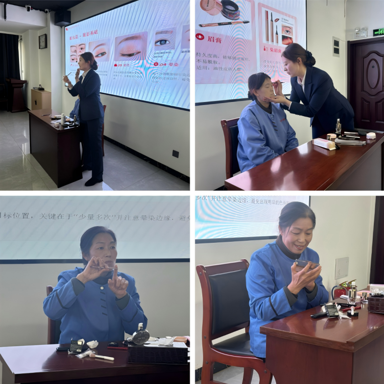 本次活動聚焦女職工最為關注的“外在形象”與“內(nèi)在修養(yǎng)”兩大主題,講師圍繞職業(yè)化妝技巧、個人形象管理以及職場禮儀禮貌規(guī)范等內(nèi)容進行系統(tǒng)講解?;瘖y與形象管理環(huán)節(jié),講師從日常護膚入手,詳細講解職場淡妝的畫法、色彩搭配以及如何根據(jù)個人膚色、臉型選擇適合的妝容與著裝風格。通過現(xiàn)場演示,直觀展示妝容變化帶來的精氣神提升,強調良好的職業(yè)形象不僅是個人魅力的展現(xiàn),更是企業(yè)對外展示的一張名片。
