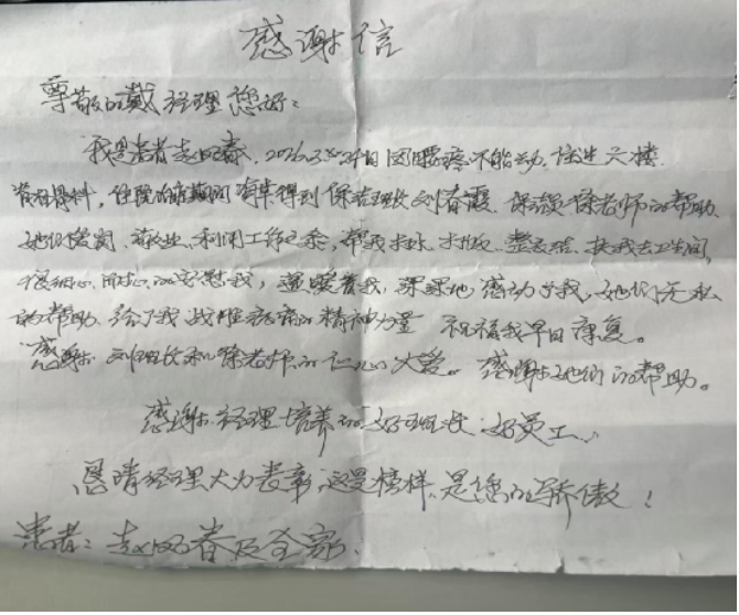 2026年4月1日,濟南連心物業(yè)駐山東電力中心醫(yī)院項目部收到患者趙鳳春手寫感謝信。信紙雖簡,字句卻滿載真誠,讓整個團隊倍感溫暖。