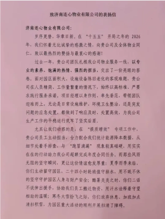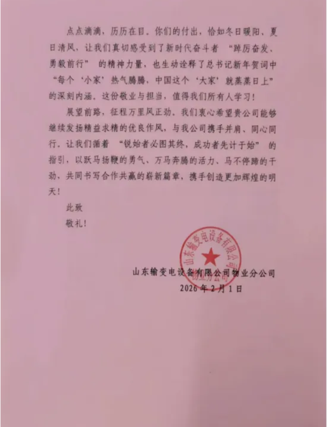 2026年2月1日,濟(jì)南連心物業(yè)有限公司收到一封來自山東輸變電設(shè)備有限公司表?yè)P(yáng)信,對(duì)連心物業(yè)過去一年的工作、服務(wù)品質(zhì)、團(tuán)隊(duì)素養(yǎng)與擔(dān)當(dāng)精神給予高度評(píng)價(jià)與認(rèn)可。